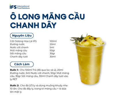 Ô Long Mãng Cầu Chanh Dây là công thức pha chế tươi mát, độc đáo, kết hợp giữa Cốt Trà Oolong Hoa Lài IFS và mứt mãng cầu tươi.