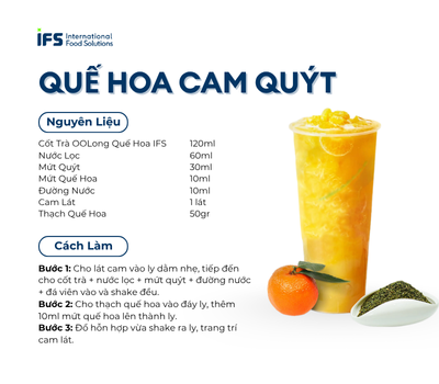Công Thức Quế Hoa Cam Quýt là sự kết hợp tinh tế giữa Trà Oolong Quế Hoa IFS thơm dịu và Mứt Quýt nguyên vị. Sự hòa quyện giữa hương hoa thanh tao và vị quýt ngọt dịu – chua nhẹ mang đến cảm giác tươi mới, tràn đầy năng lượng.