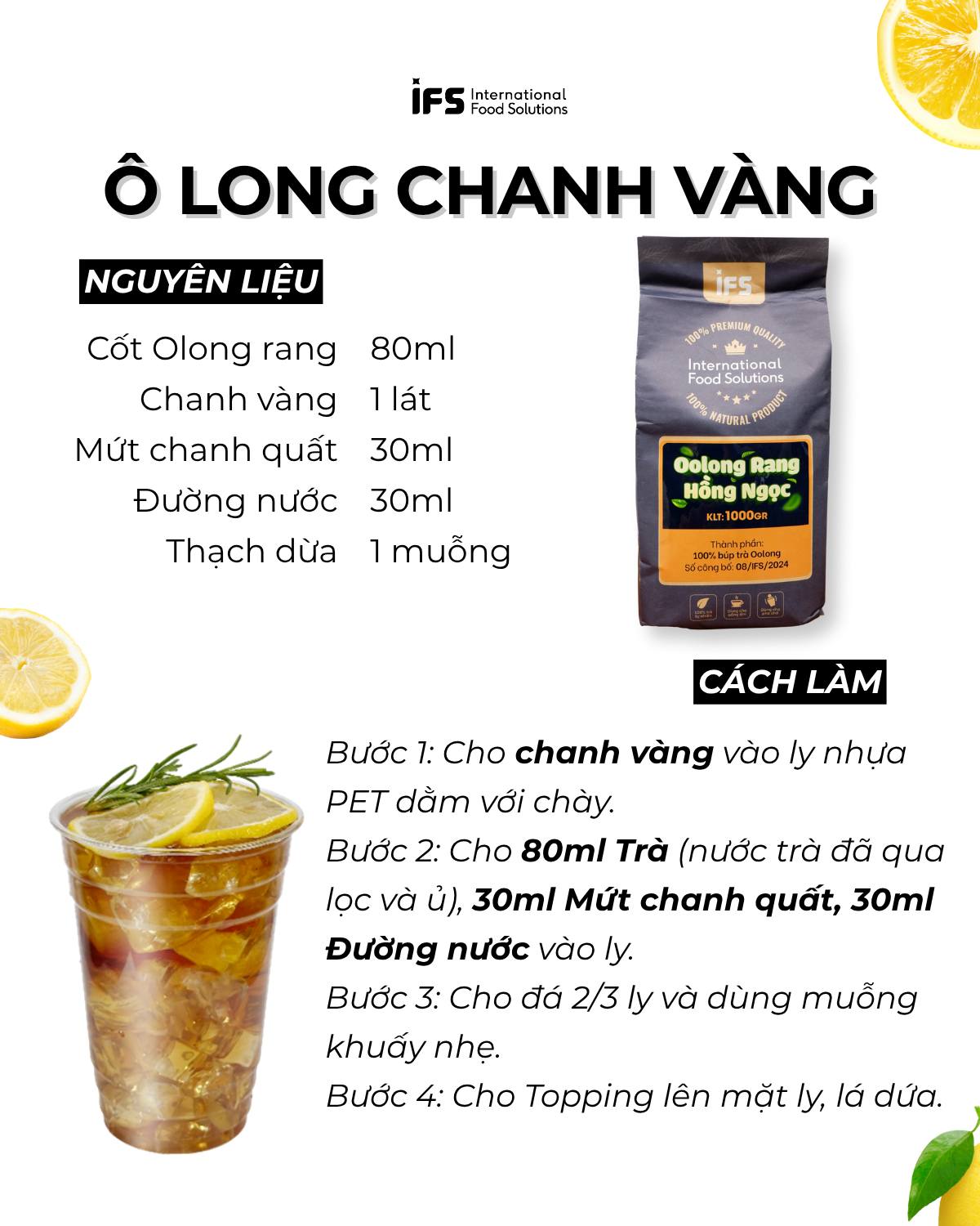 Sự kết hợp giữa Trà Ô Long rang đậm vị và Mứt Chanh Quất nhiệt đới mang lại cảm giác chua mát, thanh nhẹ – cực kỳ phù hợp cho menu mùa hè!